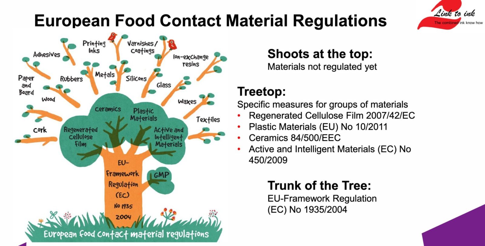 Die meisten spezifischen Vorschriften beziehen sich auf Materialien wie Kunststoffe oder Keramik, doch für Druckfarben existiert bislang keine eigene EU-Verordnung. Druckfarben müssen daher die allgemeinen Anforderungen erfüllen, wobei die europäische Kunststoffverordnung (EU) Nr. 10/2011 als Referenz für Migrationstests und Positivlisten herangezogen wird.